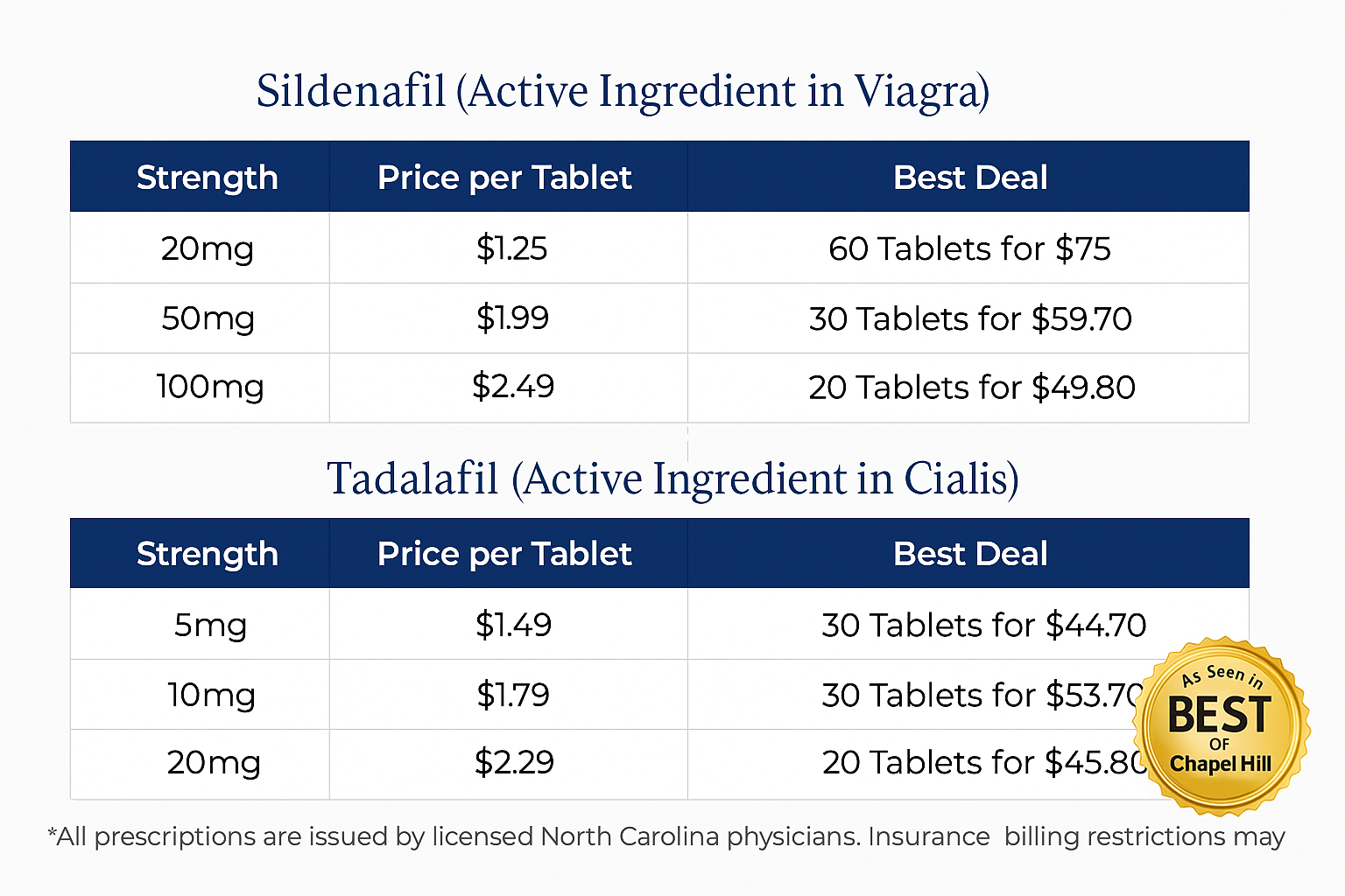 Yes. Our ED treatment program is fully legal and compliant with North Carolina regulations. All prescriptions are issued by licensed U.S. healthcare providers, and your information is kept 100% secure and HIPAA-compliant.